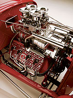 Spared on the chassis, the plater took his revenge in the engine compartment. Mark Kirby from Motor City Flathead was responsible for the 3-7/16x4-3/8-inch Flatty. Its displacement is a whopping 327 cid. The block was ground and polished for a smooth appearance and everything that could be polished or plated received the shiny treatment. Inside, NOS Ford 21A rods were machined to take larger GM rod bearings. The crankshaft bearings are pinned in their caps. Wisco lightweight pistons, a lusty Crane radius tappet cam, individually ground and fitted non-adjustable tappets, oversized valves (1.7-inch intakes, 1.6-inch exhausts), MCF finned high-compression heads and extensive port, polish, and relief work ensure a smooth and fast mixture-flow from an extensively modified B&M supercharger on an MCF intake manifold.