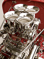 Bored and stroked (327 inches) Flatheads with blowers and conventional twin-carb intakes suffer from a lack of fuel. Kirby neatly solved the problem a la Tom Beatty's four-carb setup. Nestled together, two carbs on this 97 quartet run backward, two run conventionally.