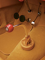 Tremec World Class Mustang five-speed gearbox uses GM tailshaft so the Hurst shifter is located in the proper place. A '32-type teaspoon pedal, classic round brake, and clutch pedals echo this roadsters nostalgia theme.