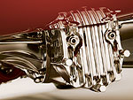 Like that intake? Four plated Stromberg 97s (two of them running backward) are topped with flared and Siamesed velocity stacks. Mark designed and machined the unique four-carb manifold, drilled it out internally for hidden fuel and vacuum lines, then machined off the top of the blower to accept it. He also fabricated a discrete new pop-off valve, with springs facing the inside of the engine valley. There's a custom oil pan Jon and Mark reworked to accept a full-flow oil filtration system.